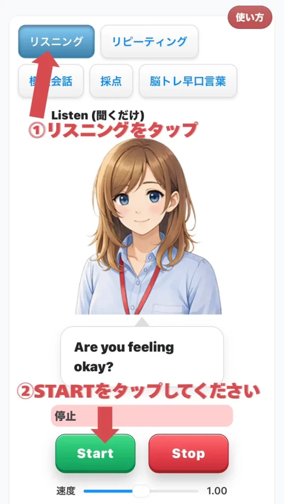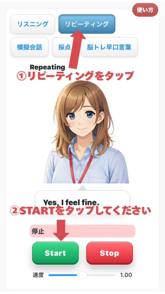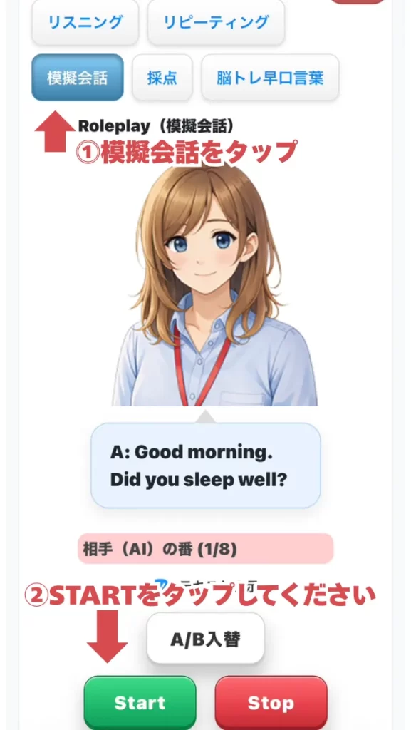 その後AIがシナリオ(例文)にそって発音しますので、交互に会話練習を行ってください。