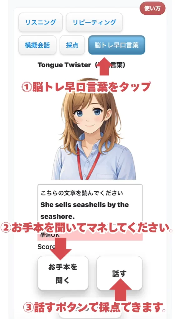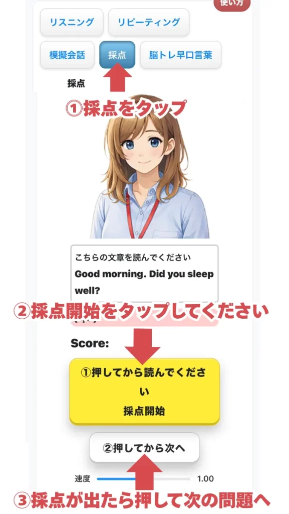 採点もご用意。採点する場合は「話す」ボタンを押して発音してみてください。